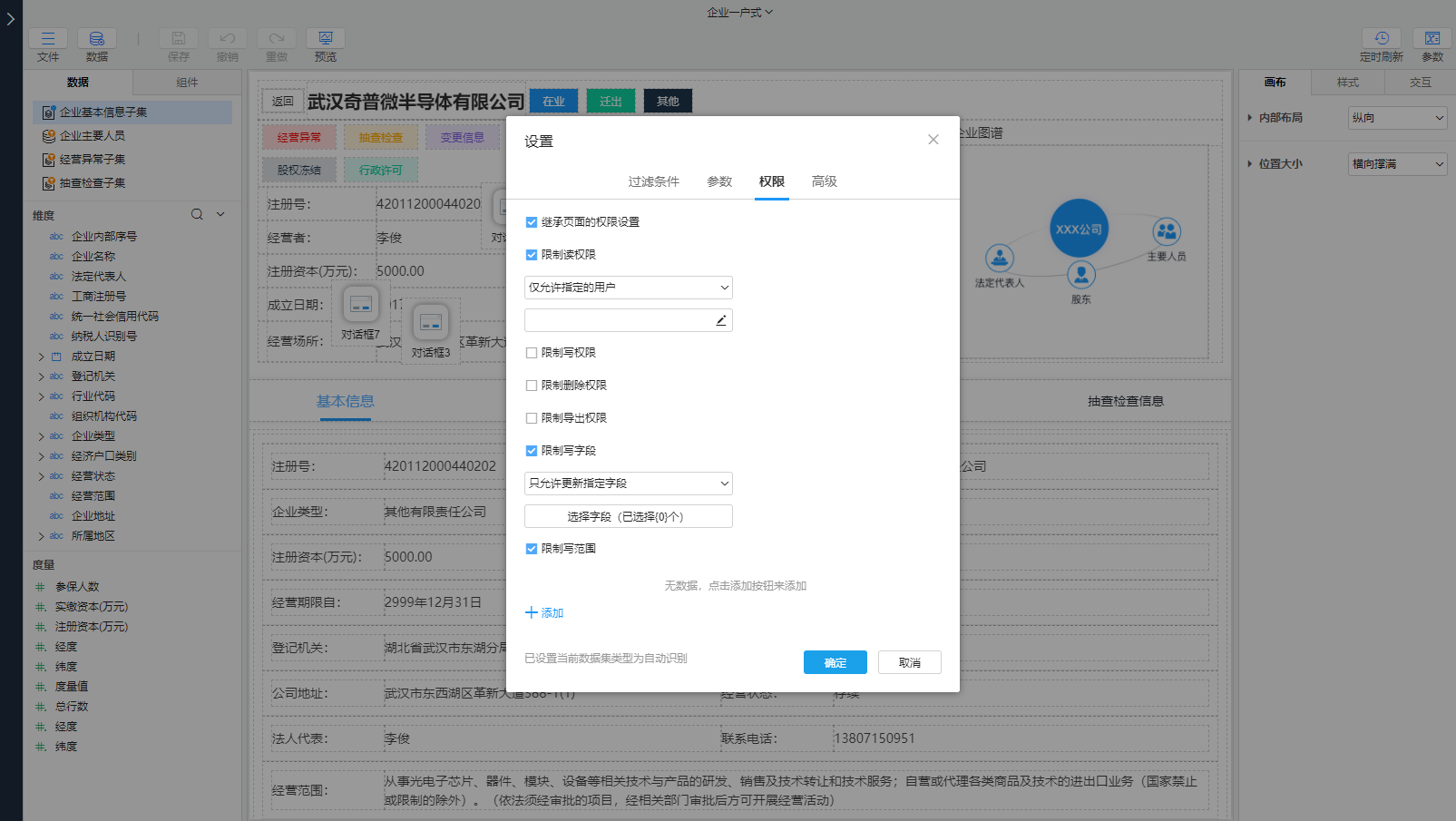 SuperPage中组件可提交数据至数据模型中,故可为数据集添加读写等权限,点击数据集模型名称右键选择设置>权限