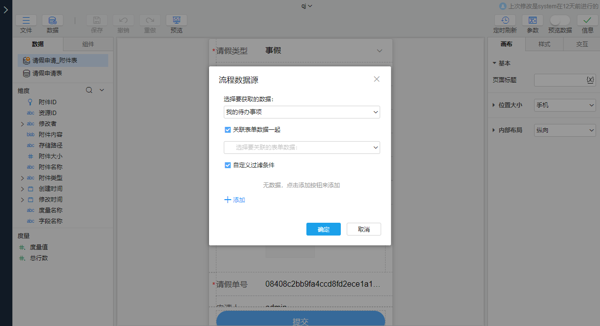 - 关联表单数据一起:流程的任务数据是不包含业务数据的,当用户希望查询的任务列表能带上一些业务数据的信息时,比如需要查询出请假申请的请假人和请假天数,此时可以勾选关联表单数据一起并选择一个业务表作为关联对象,系统会自行将选择的业务表与流程任务表通过业务代码进行关联