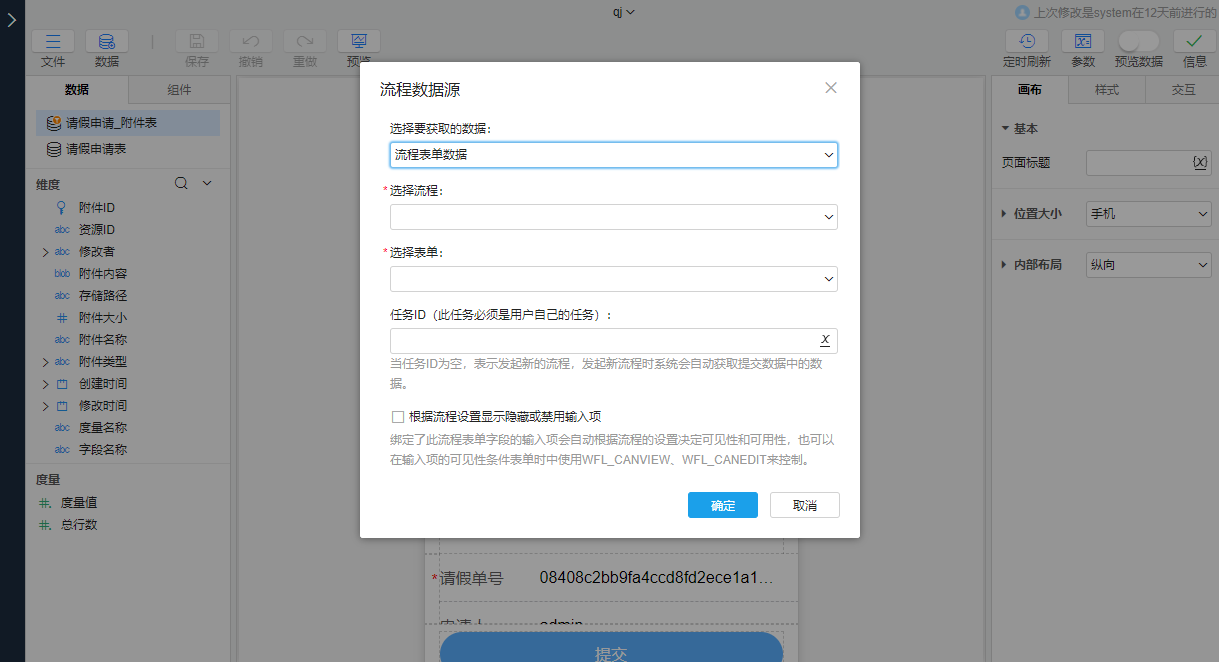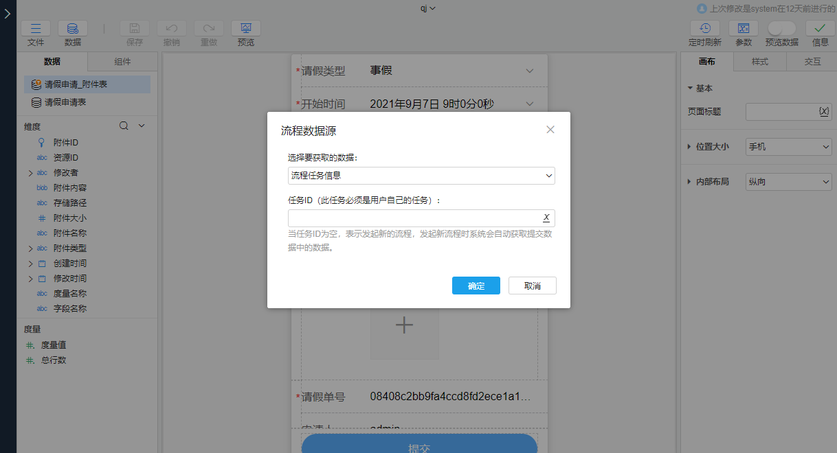 当需要在页面中获取到当前正在处理的流程任务的相关信息时,比如当前任务处于流程的哪个环节,需要引入流程任务信息,流程任务信息的来源也是流程任务表,不同于我的待办,流程任务信息总是单行的,通过数据源设置上的任务ID来自动过滤流程任务表来得到唯一行的任务数据,具体设置如下:
