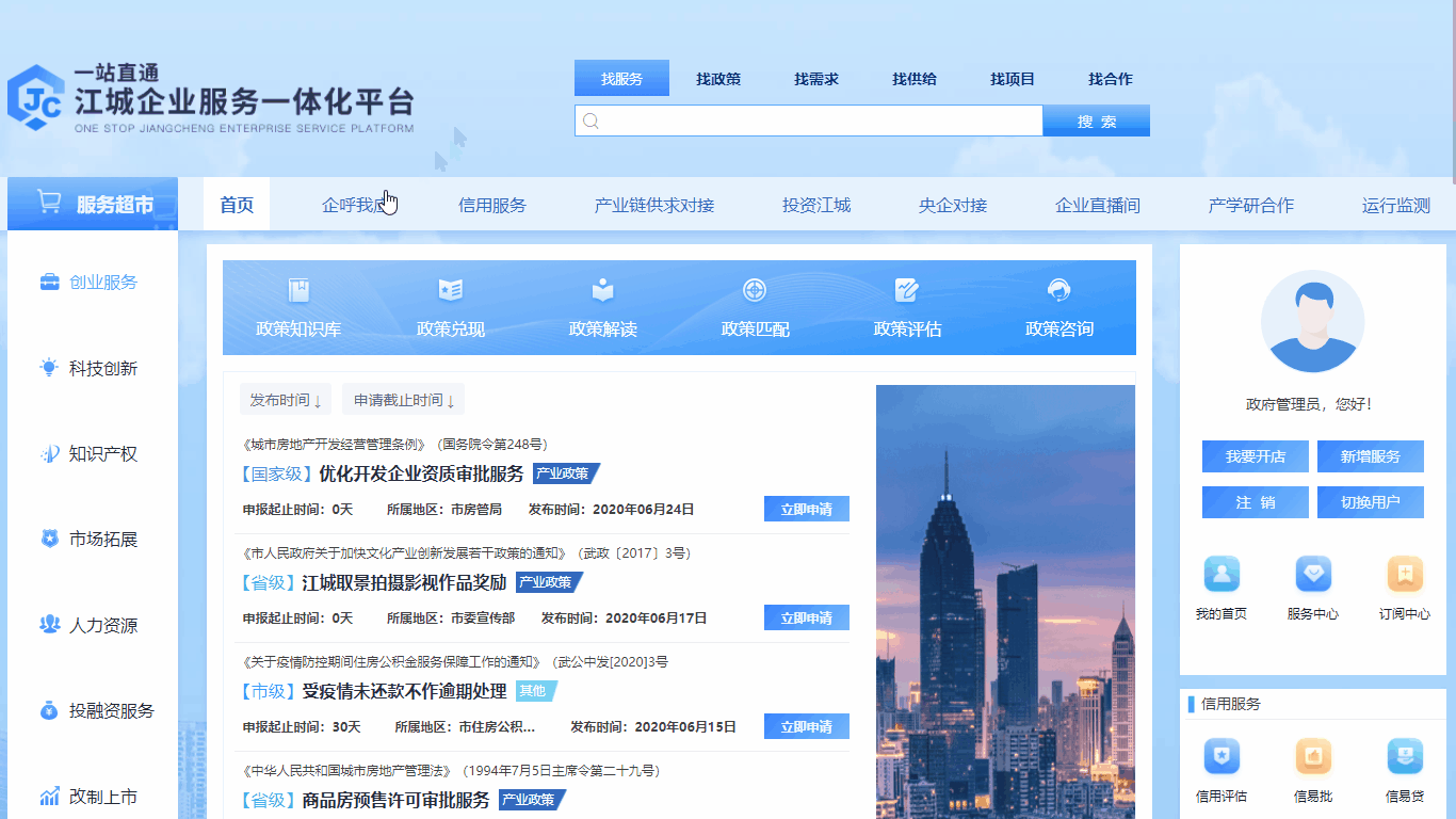 • 江城市民之家是新拓展的客户,客户希望打造江城企业服务一体化平台,业务内容可以参考上海市企业服务云的形式(http://www.ssme.sh.gov.cn/)