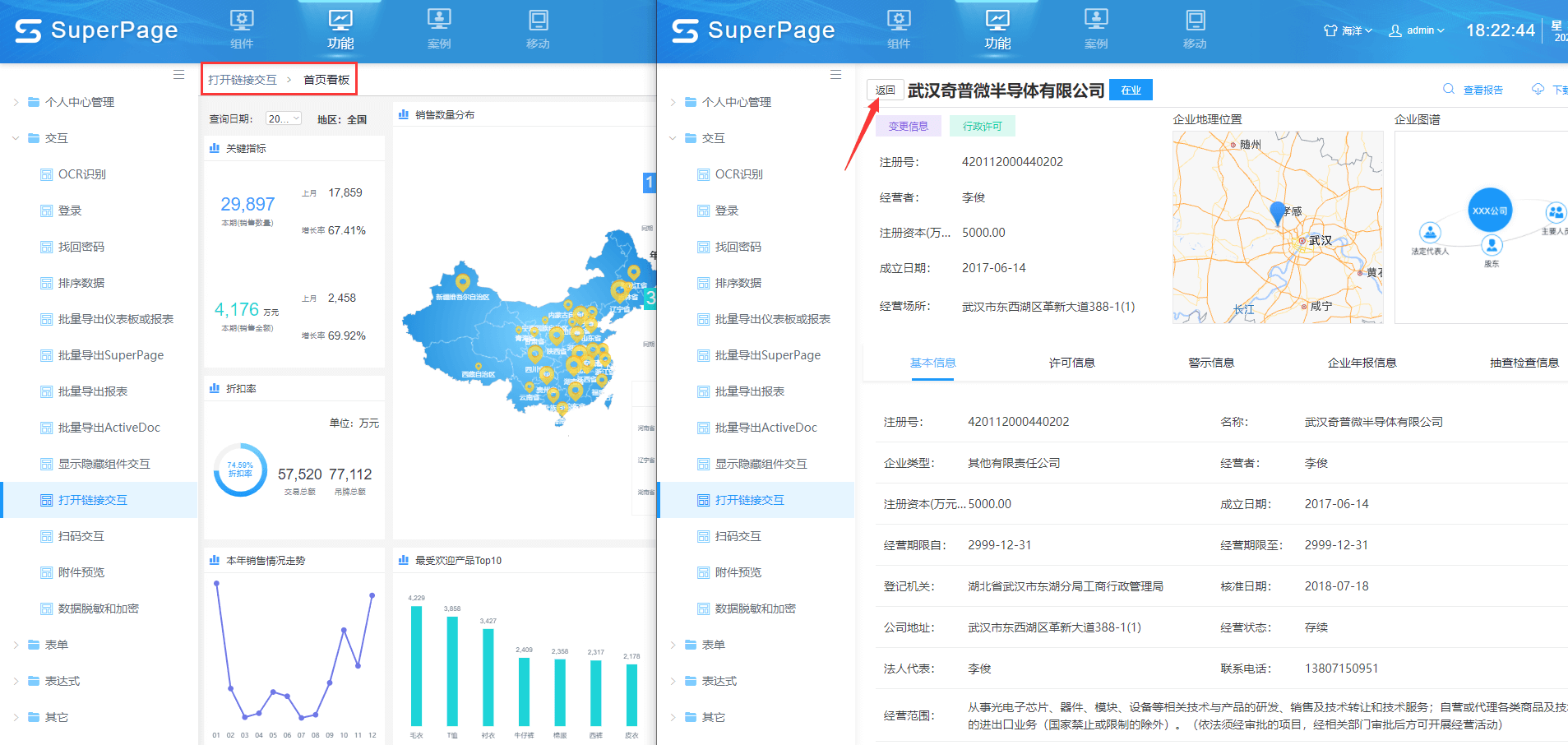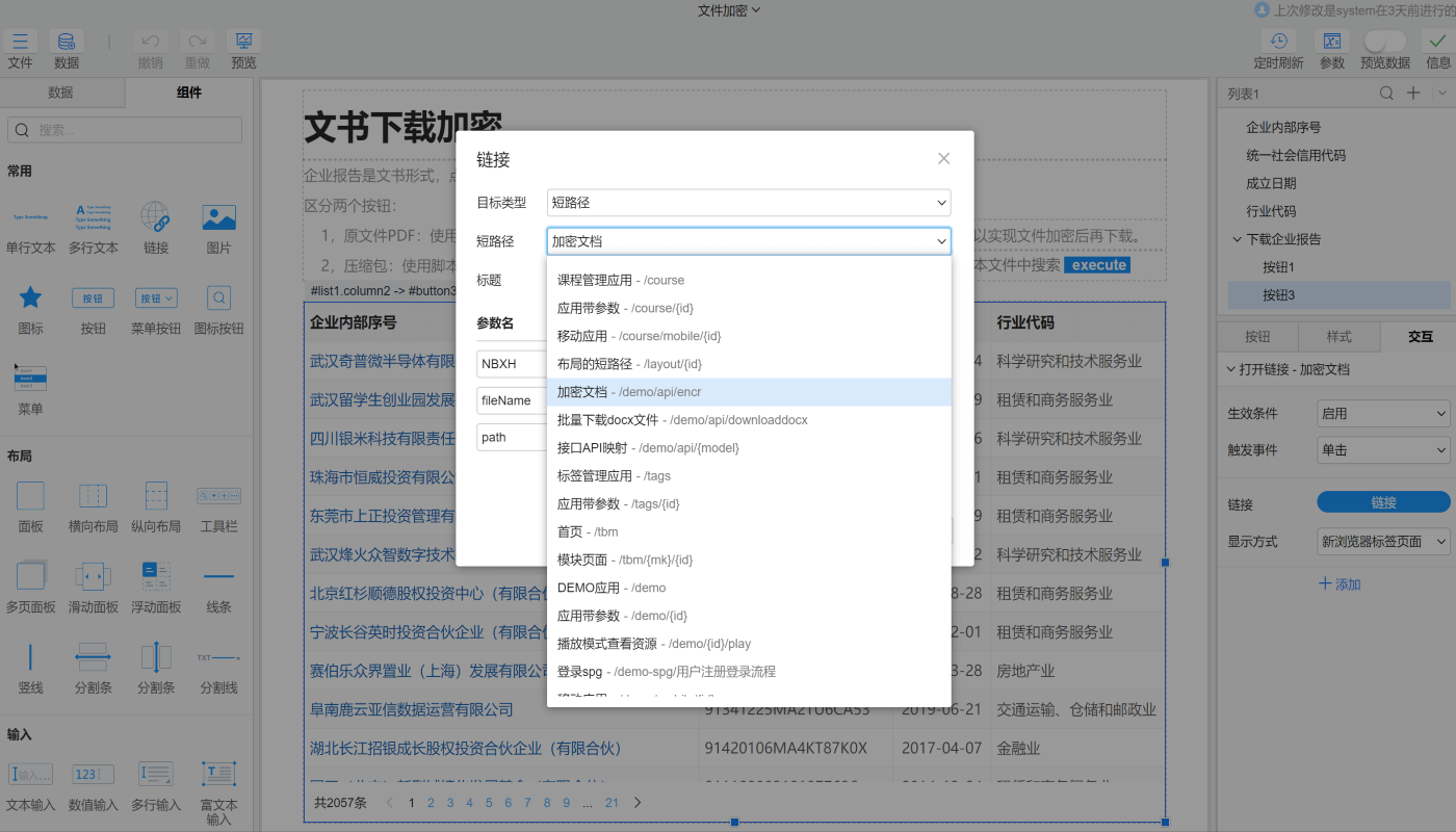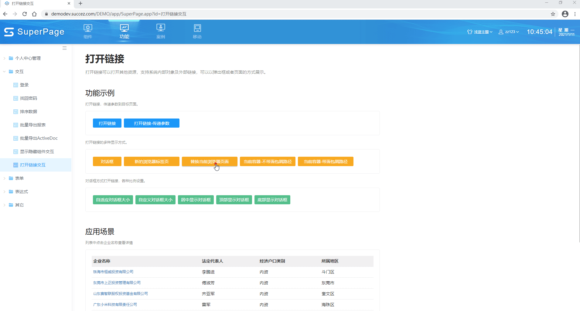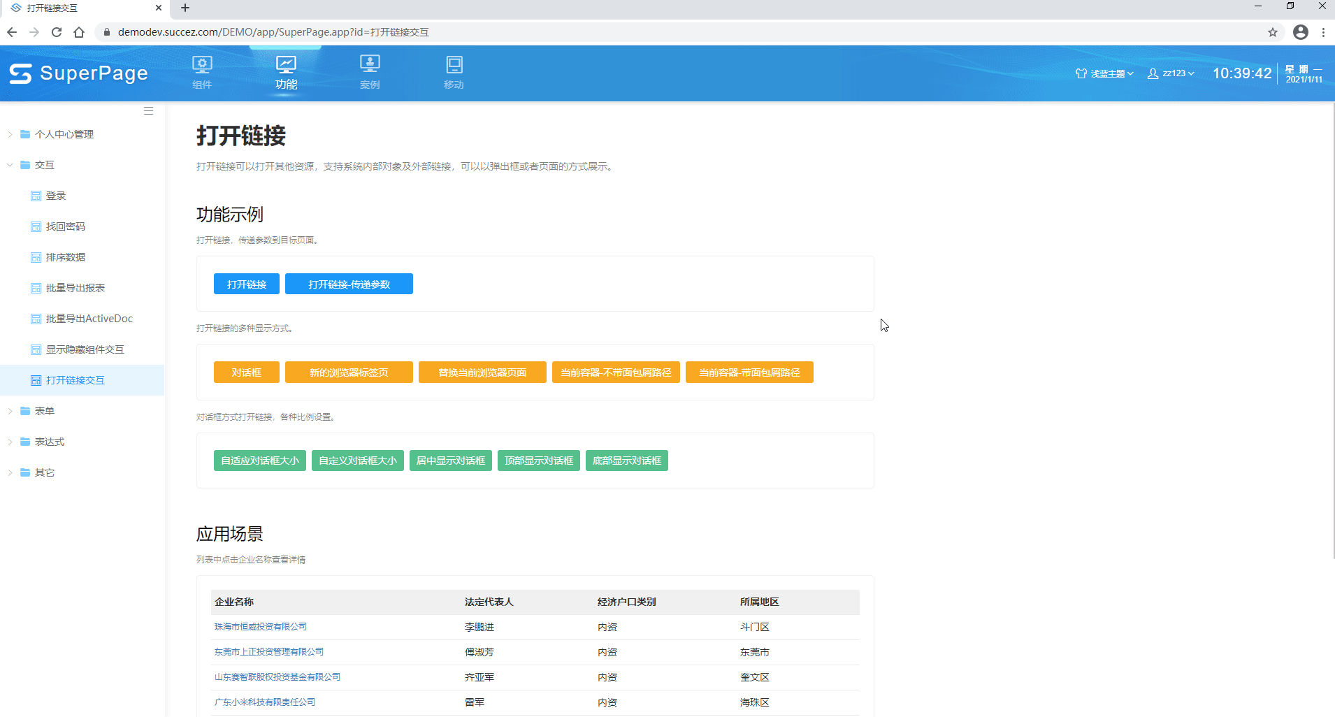 打开链接交互用于跳转到其他对象,支持系统内部对象及外部链接,可以以弹出对话框或页面的方式展示。如列表展示各企业信息,点击企业名称查看企业详情:
