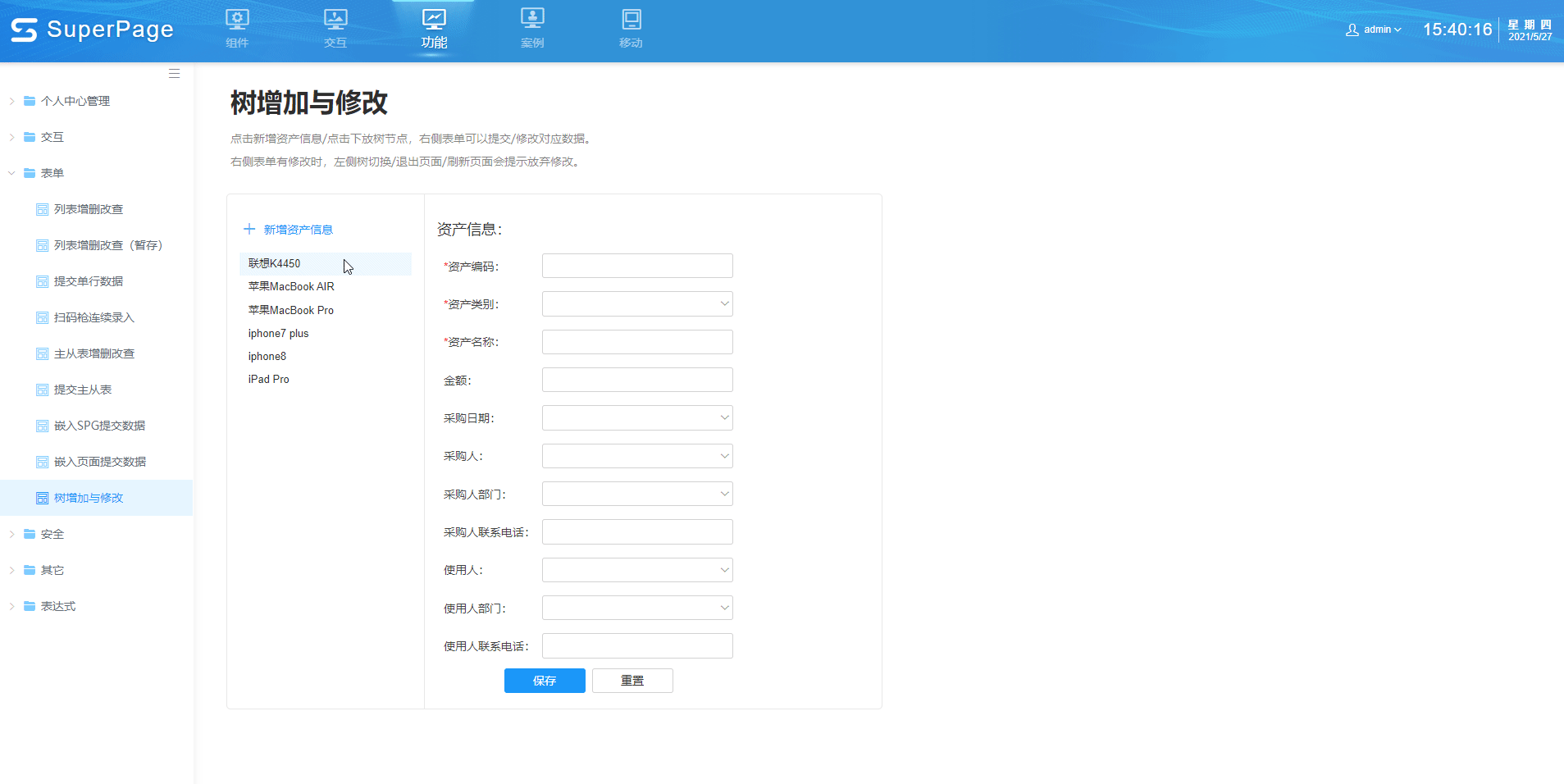 - 在“表单”中修改资产信息,点击重置按钮,已修改的内容将被还原