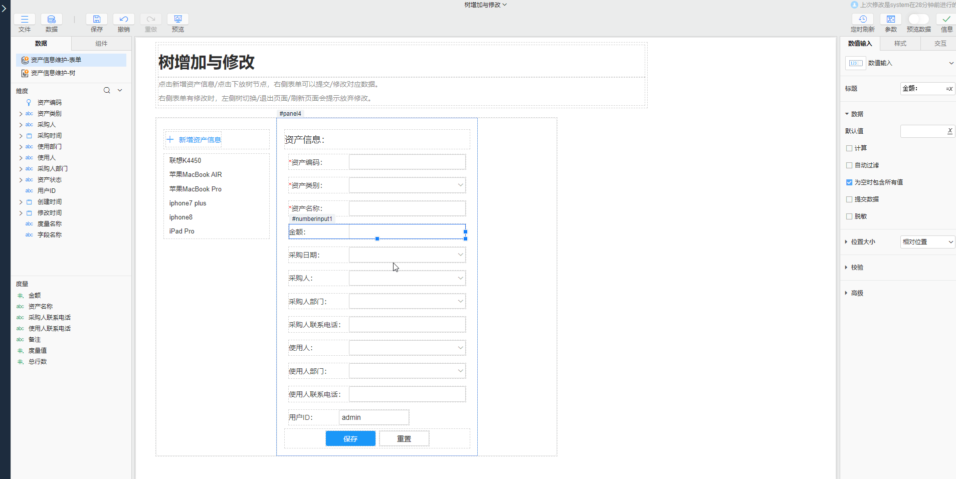 - 输入组件绑定字段:为文本输入组件绑定字段,使“资产名称”、“金额”等组件内容能够自动加载原数据